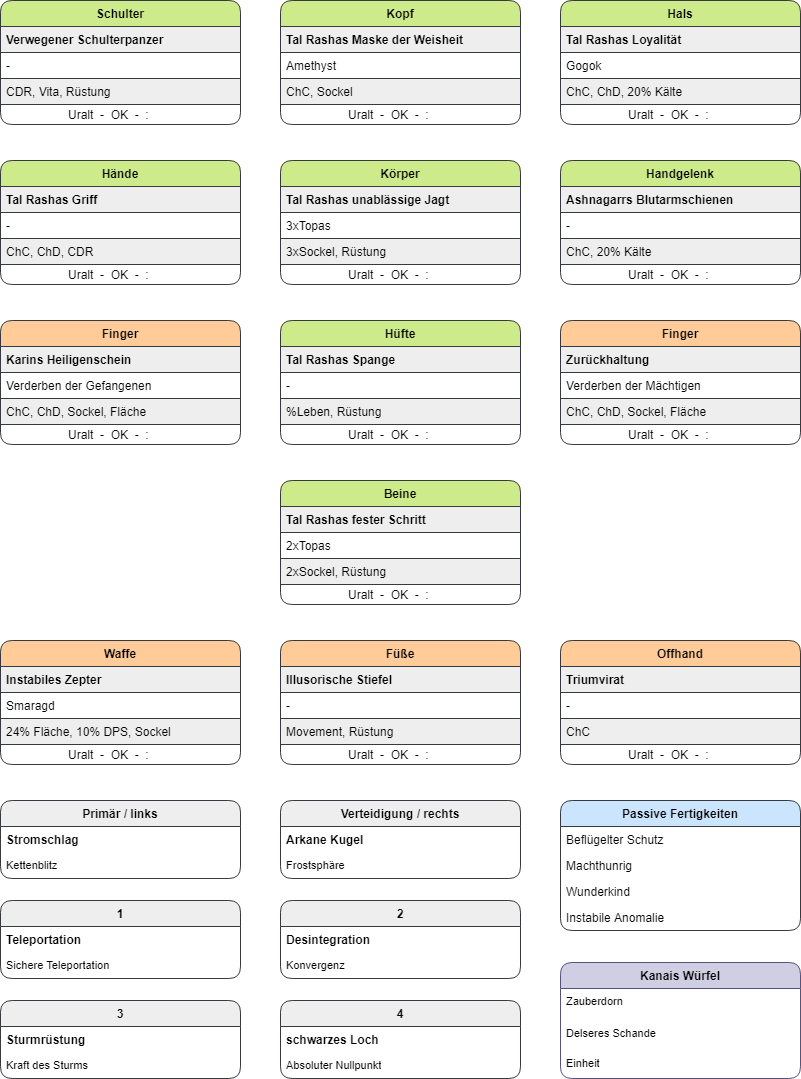 Schultern sind frei wählbar. Legendäre Edelsteine sind tauschbar, z.B. Esoterischer Wandel, oder die beim Best Build benötigt werden. Einheit kann getauscht werden, bringt aber am Anfang Zähigkeit.
